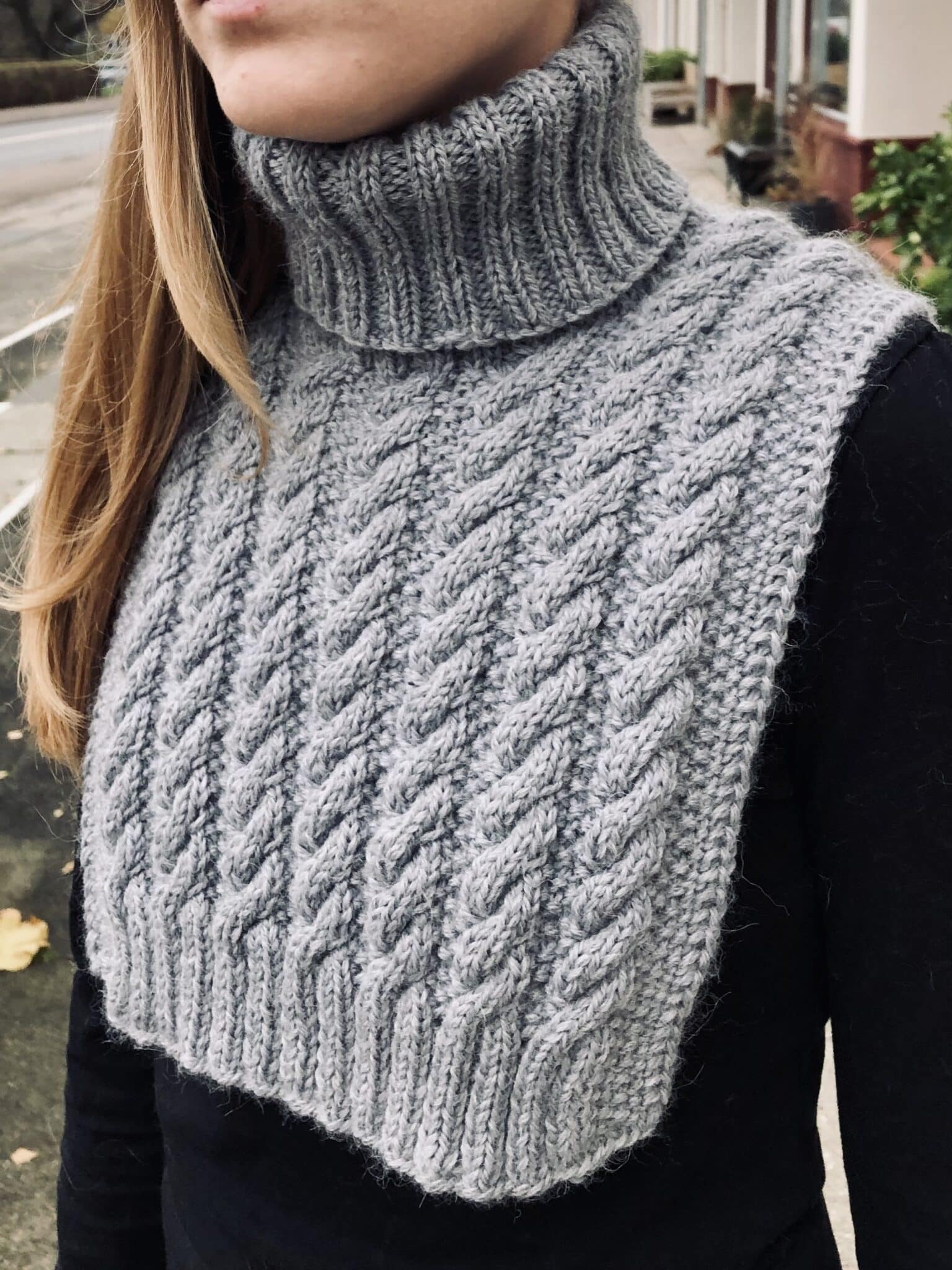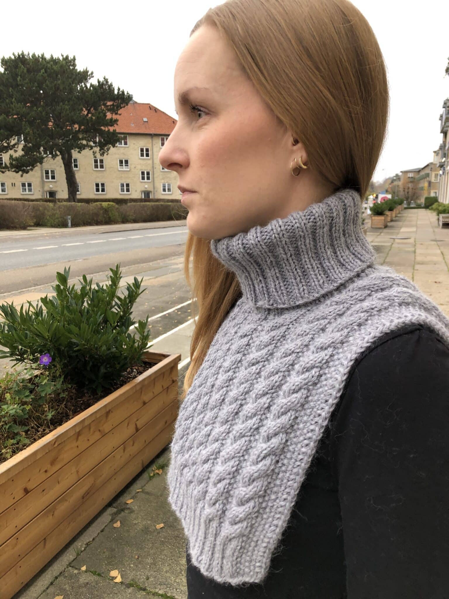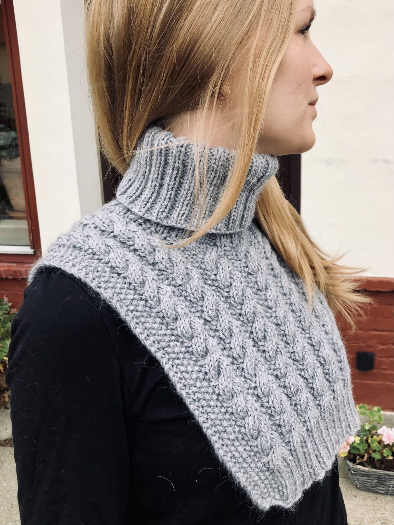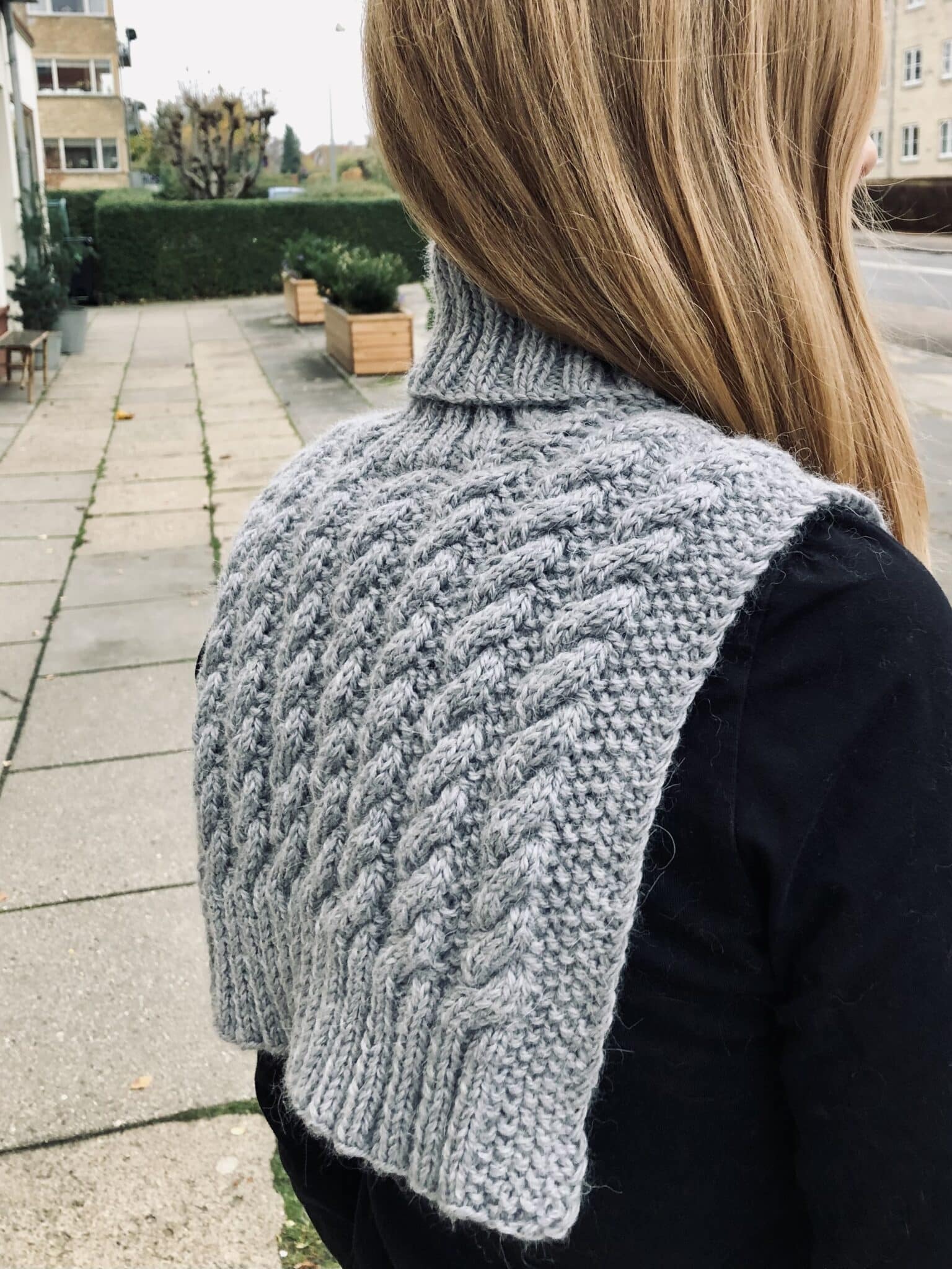 Øvrigt: Halsedissen strikkes frem og tilbage i snoningsmønster, fra rygstykke til forstykke, i ét, og masker samles op til kraven, som strikkes rundt i dobbelt rib.